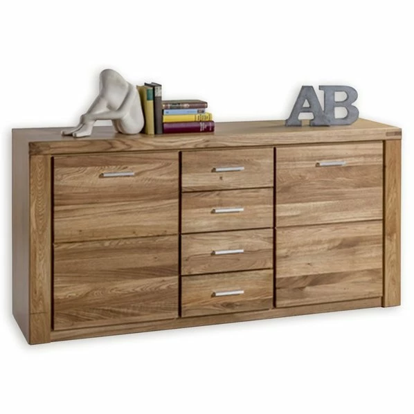 Das Sideboard aus Wildeiche Massivholz ist mit 2 Holztüren außen und 4 Schubfächern mittig untereinander ausgestattet. Hinter den beiden Türen befinden sich je ein Einlegeboden. Bringen Sie also in 4 Fächern und 4 Schubfächern all Ihre Utensilien unter und platzieren Sie zum Beispiel oben auf dem Sideboard hübsche Deko.