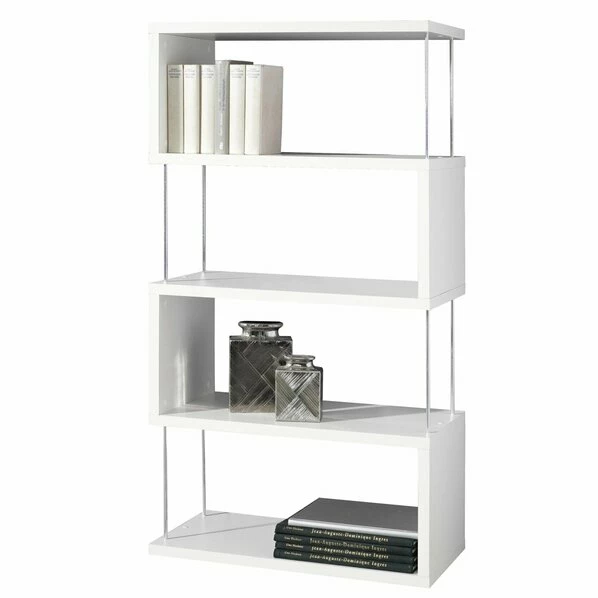 Modernes Standregal in mattem Weiß. Auf fünf Ablagen kannst du dekorative Elemente wie Vasen, Bilderrahmen oder Dekoobjekte platzieren. Die silberfarbenen Metallstäbe geben dem Regal das gewisse Etwas.