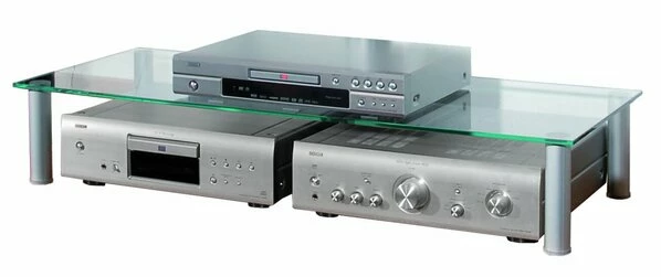 TV-Aufsatz mit Aluminium-Füßen und Klarglasplatte. Der Glasaufsatz bietet zusätzlich Platz für Geräte auf einem TV-Möbel oder einer Wohnwand.