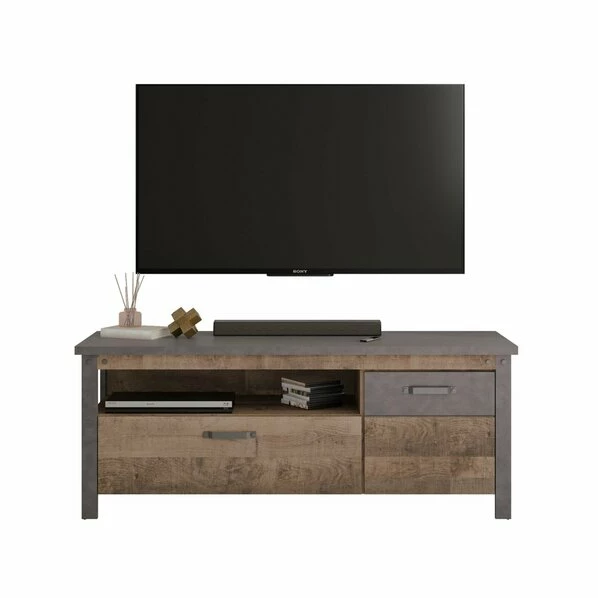 Mit diesem TV-Lowboard OLIVER vervollständigen Sie ihr Wohnzimmer im Industrial-Style. Ihre Spielekonsolen oder TV-Receiver finden in dem offenen Fach ihre Plätze. Hinter einer Tür und einer Klappe bietet es Stauraum für weitere Gebrauchsgegenstände. Die Kombination aus Taba-Eiche und Matera Nachbildung verleiht diesem TV-Lowboard das gewisse Etwas!