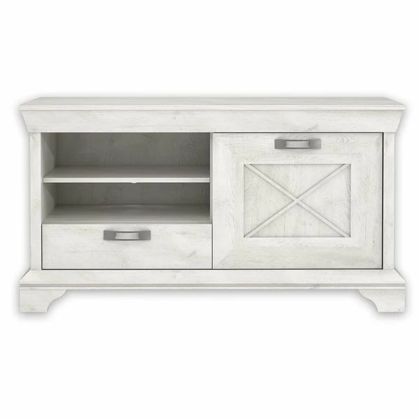 Das TV-Lowboard speigelt den charmanten Landhausstil wider und wird somit für ein gemütliches Ambiente in Ihrem Wohnraum sorgen. Die weiße Pinie Nachbildung verleiht dem Möbelstück eine sehr schöne Optik, die von den silbernen Metallgriffen stimmig abgerundet wird. Hinter der Tür, im Schubkasten und in den beiden offenen Fächern finden Sie reichlich Plat für Ihr TV-Zubehör und Co.
