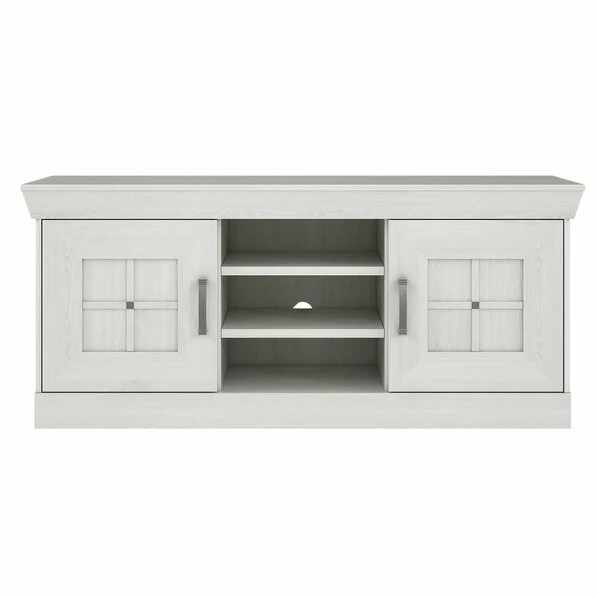 Das etwa 143 Zentimeter breite TV-Lowboard präsentiert sich im charmanten Landhausstil und kann hinter zwei Türen und in drei offenen Fächern mit reichlich Stauraum punkten. Die Schneeeiche Nachbildung lässt sich mit den unterschiedlichsten Einrichtungen kombinieren und die Metallgriffe in Messing-Optik runden die tolle Optik noch stimmig ab.