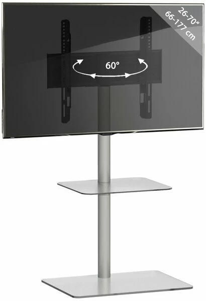 Der TV-Standfuß ALANI aus Stahl mit Zwischenboden und Bodenplatte aus ESG-Sicherheitsglas. Dieser TV-Standfuß ist geeignet für LED-/LCD- und PLASMA TV-Geräte mit 26-70 Zoll. Er bietet Ihnen einen Zwischenboden für zusätzlichen Ablageplatz für beispielsweise Fernbedienungen oder anderes TV-Zubehör. Durch die verdeckte Kabelführung innerhalb des Gestells gehört der Kabelsalat hinter dem Fernseher der Vergangenheit an. Die Fernsehhalterung ist um ca. 60 Grad schwenkbar, so dass Sie die Position des Fernsehers an Ihre Bedürfnisse anpassen können.