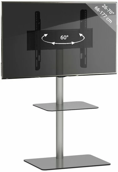 Der TV-Standfuß ALANI aus Metall mit Zwischenboden und Bodenplatte aus ESG-Sicherheitsglas. Dieser TV-Standfuß ist geeignet für LED-/LCD- und PLASMA TV-Geräte mit 26-70 Zoll. Er bietet Ihnen einen Zwischenboden für zusätzlichen Ablageplatz für beispielsweise Fernbedienungen oder anderes TV-Zubehör. Durch die verdeckte Kabelführung innerhalb des Gestells gehört der Kabelsalat hinter dem Fernseher der Vergangenheit an. Die Fernsehhalterung ist um ca. 60 Grad schwenkbar, so dass Sie die Position des Fernsehers an Ihre Bedürfnisse anpassen können.
