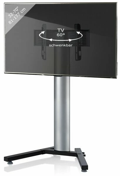 Schöner Standfuß aus Aluminium. Eine verdeckte Kabelführung am Alurohr verhindert lästigen Kabelsalat. Die TV-Halterung ist um 60 Grad schwenkbar und eignet sich für Geräte mit den Formaten 32-70 Zoll. Das zeitlose Design lässt sich vielseitig kombinieren.