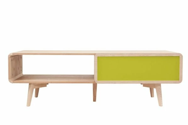 Der TV-Tisch ADDISON II besticht durch sein ausgefallenes Design. Seine stark abgerundeten Ecken sind ein toller Eyecatcher, welcher durch die grüne Schubkastenfront unterstrichen wird. Sein robuster Stand ist durch die vier Massivholzbeine inklusive Stützfuß garantiert. Der Korpus ist mit einem Esche-Furnier ausgestattet.