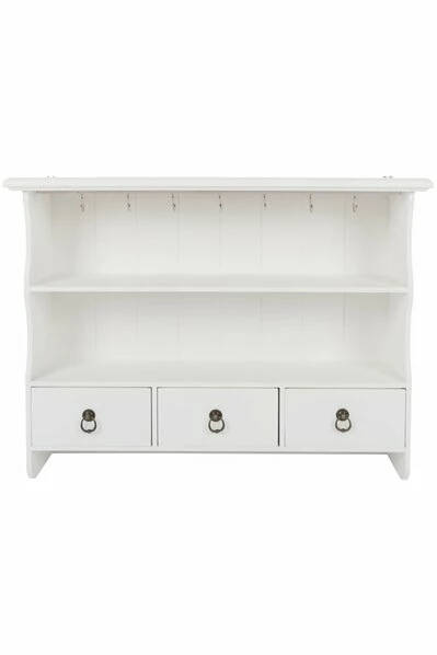 Dieses schöne Wandregal überzeugt durch seine charmante Optik im Landhausstil. Das weiße Regal besitzt eine Rückwand im Paneel-Design, sowie zwei offene Fächer und drei Schubkästen mit Kassettenfront und Ringgriffen. Zusätzlich unterstreichen Ringhaken zur praktischen und stilvollen Aufbewahrung das verspielte Design.